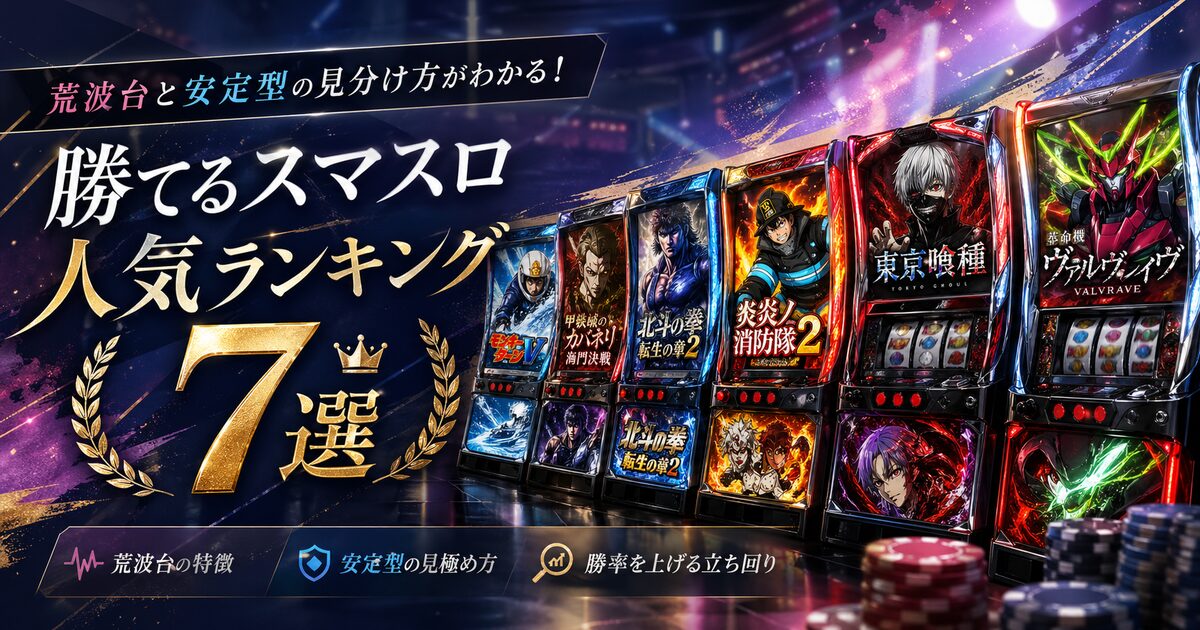 スマスロの天井恩恵ランキングを知りたい人向けに、主要機種の恩恵の強さ、朝一短縮の有無、実際の拾いやすさまで整理しました。北斗、よう実、モンキーターンV、かぐや様などの特徴を比較しながら、強い台の見分け方や朝一で狙いやすい機種、失敗しやすい注意点まで実戦目線でまとめています。